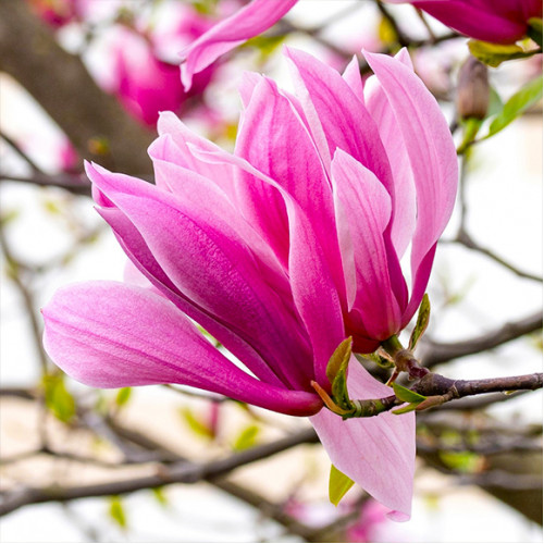 | Магнолия Гэлекси (Magnolia Galaxy) | Магнолия Galaxy — эффектное декоративное листопадное дерево с изящной пирамидальной формой и тёмно‑зелёной листвой, которая создаёт плотную, выразительную крону. Весной, в апреле‑мае, до появления листьев ветки покрываются крупными тюльпановидными цветами насыщенного пурпурно‑розового оттенка, слегка ароматными и особенно эффектными в садовом ландшафте. | |