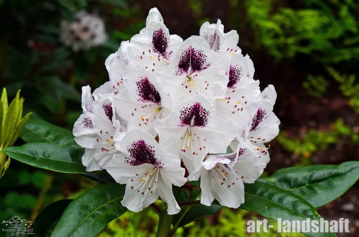 | Рододендрон "Кальсап" | Рододендрон Кальсап — эффектный вечнозелёный декоративный кустарник с плотной кроной и крупными глянцевыми зелёными листьями. Весной он покрывается роскошными соцветиями белых цветов, украшенными контрастным тёмно‑бордовым (гранатовым) пятном в центре, что делает его особенно привлекательным в саду и на цветочных клумбах. | |