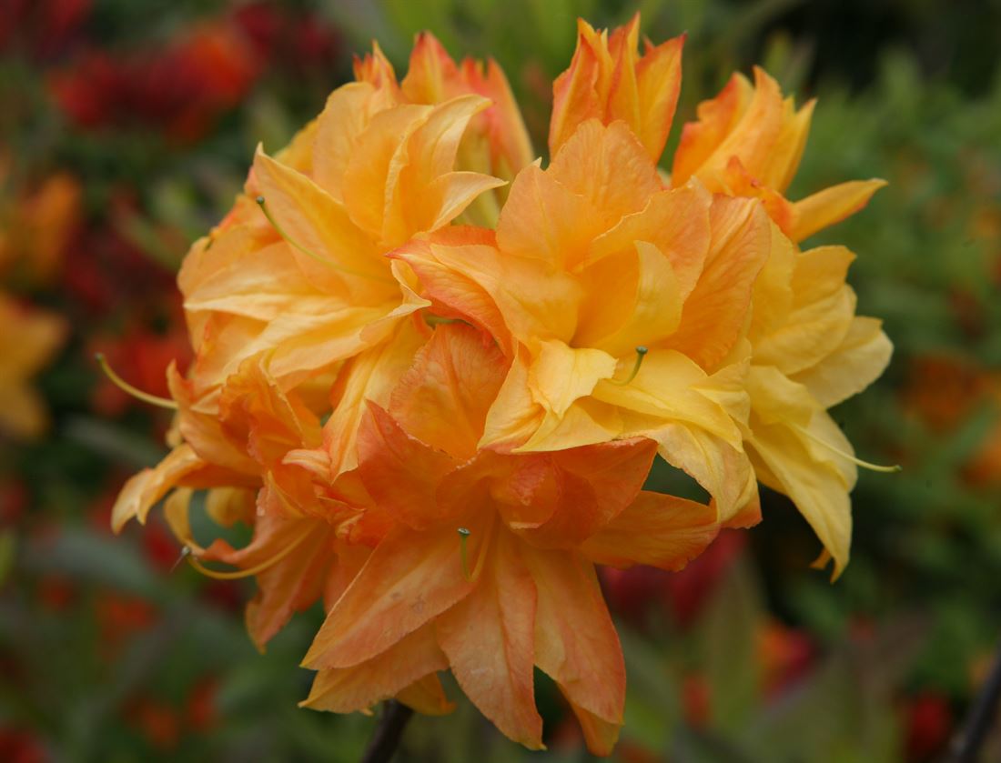 | Рододендрон Sun Star — декоративный листопадный рододендрон/азалия с эффектными цветками яркого желто‑оранжевого тона, которые распускаются весной и создают яркий акцент в саду. Куст формирует компактную, аккуратную крону высотой до ≈1–1,5 м, подходит для бордюров, клумб и смешанных посадок. |
