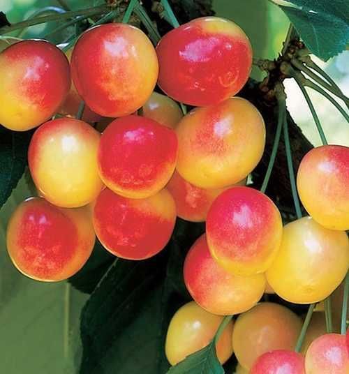 | Черешня Райнер — один из самых популярных десертных сортов сладкой черешни, известный своими яркими крупными плодами с жёлтой кожицей и розово‑красным румянцем. Ягоды обладают тонкой кожицей, плотной кремово‑жёлтой мякотью и очень сладким, нежным вкусом, что делает их особенно ценными для свежего употребления и десертов. |