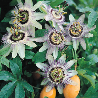 | Passiflora caerulea, известная как голубая пассифлора или голубой страстоцвет, — эффектная вьющаяся лиана с крупными декоративными цветами, которые имеют белые лепестки и сложную корону из синих, белых и фиолетовых нитей. После цветения на растении появляются оранжево‑жёлтые плоды маракуйи. |